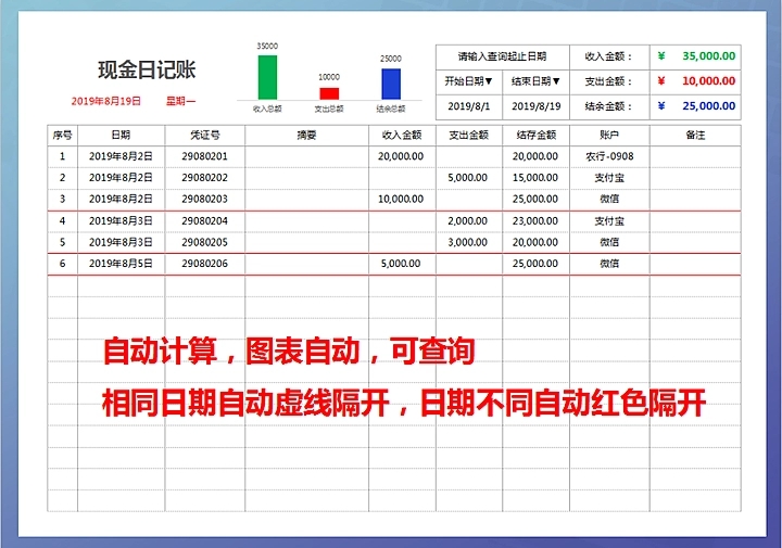 可查询财务现金日记账excel表格模板自动计算图表分析收入支出结余金额