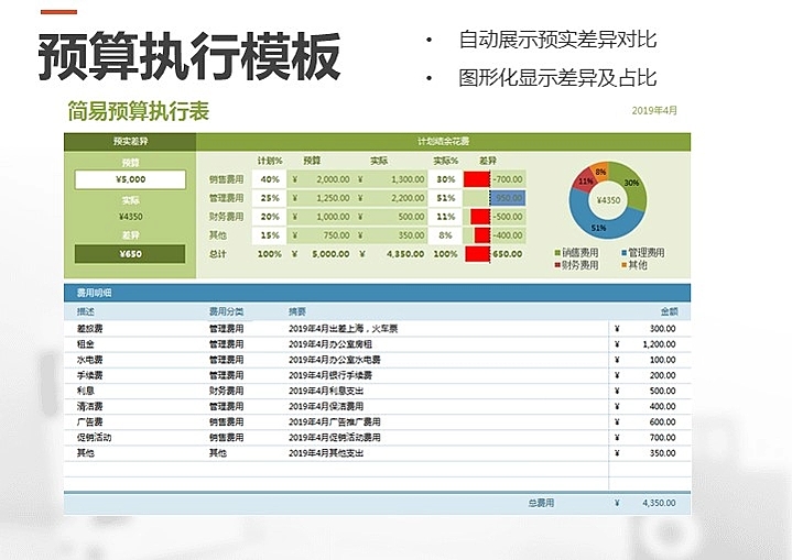 预算执行模板excel表格自动展示预算与实际差异对比图形化显示