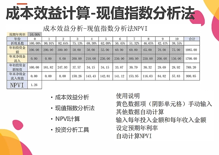 Excel表格模板成本效益计算现值指数分析法NPVI自动计算投资分析