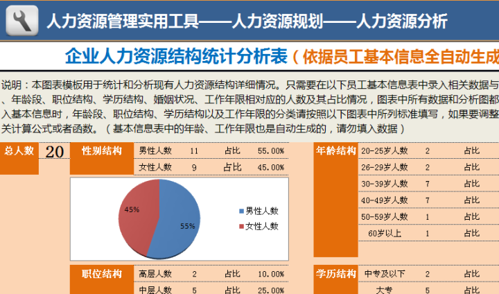 企业人力资源结构统计分析表(全自动生成数据与图表)Excel模板