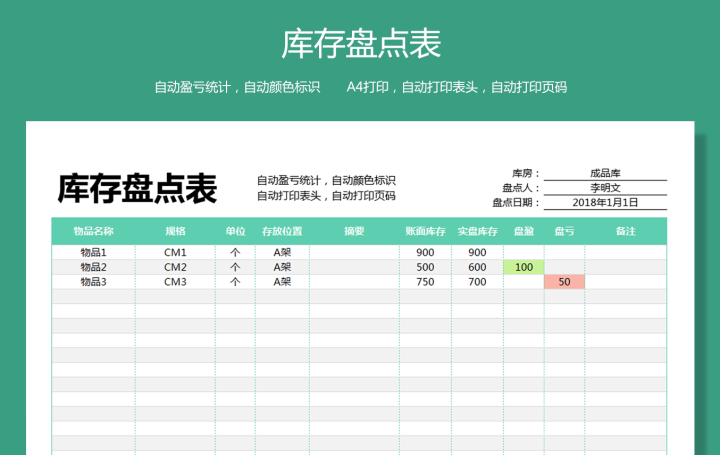 库存盘点表 库房盘点表(自动盈亏自动颜色标识)Excel模板表格