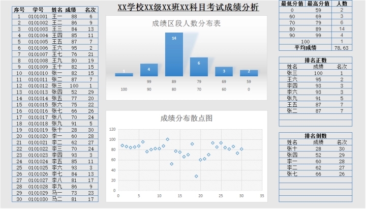 单科单次成绩分析excel表格模板科目考试成绩分析平均分排名倒数