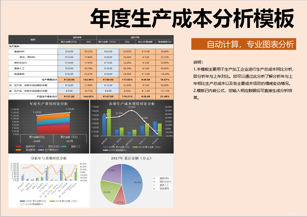 年度生产成本分析表与上一年度同比分析Excel表格模板