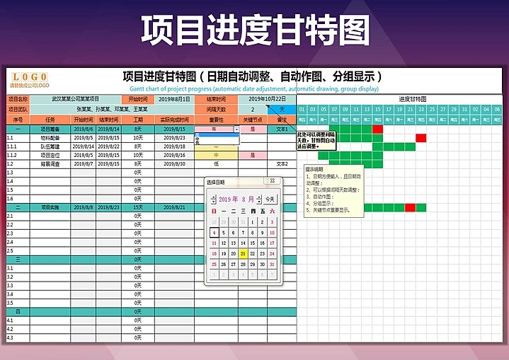 项目进度甘特图(日期自动调整、自动作图、分组显示)