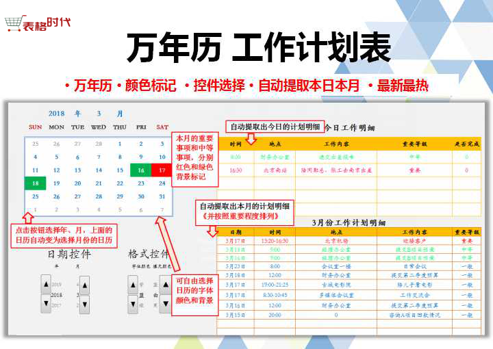 工作计划表万年历事项自动提取颜色标记Excel表格模板工作明细表