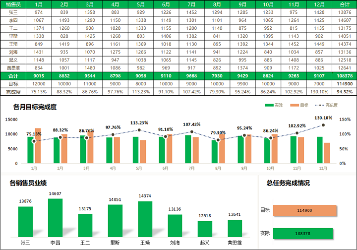 销售业绩分析报表自动生成图表自动计算销售目标Excel表格函数
