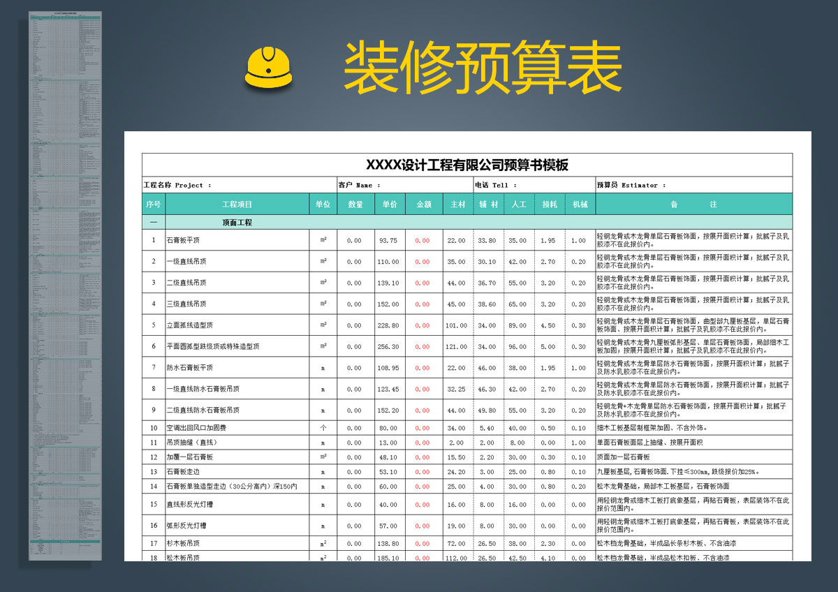 工程房子公司家庭住宅装修预算表Excel模板表格自动统计