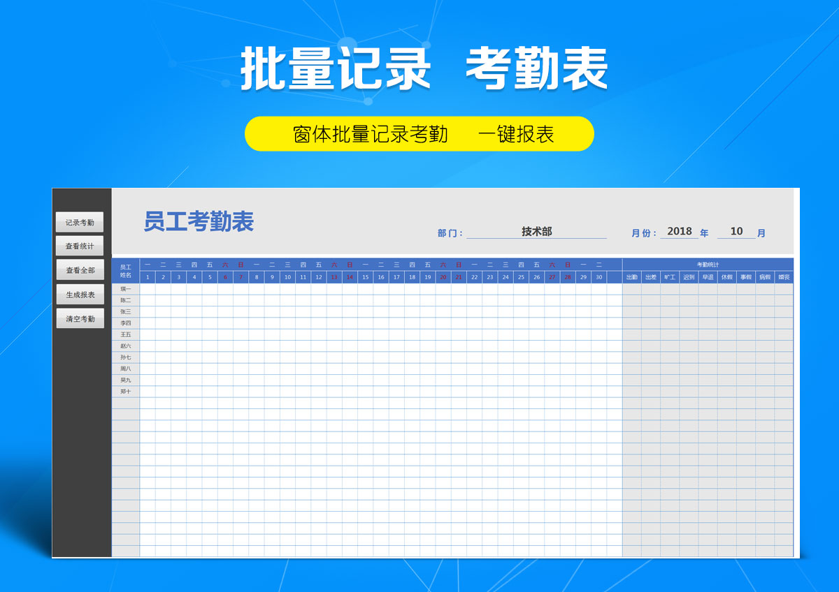 员工考勤表(窗体批量记录,一键统计报表)Excel模板表格