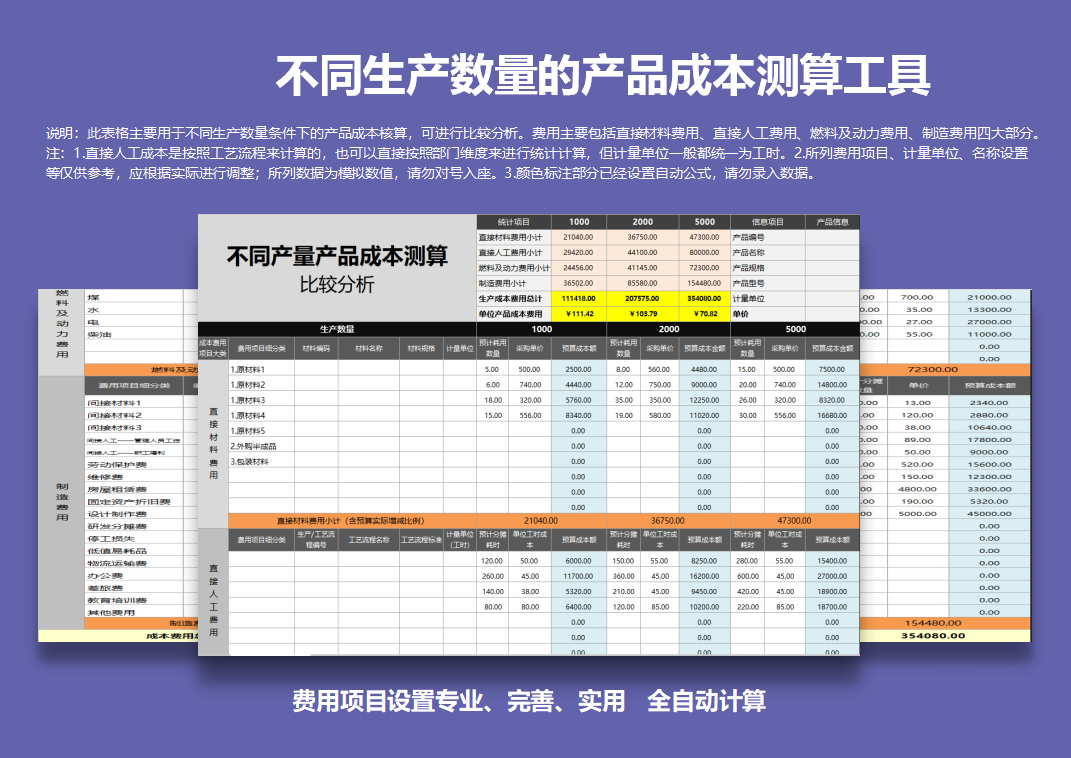 不同生产数量的产品成本测算工具Excel表格模板