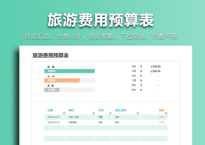 旅游预算表-预算计划表-旅游费用统计表Excel模板表格自动统计