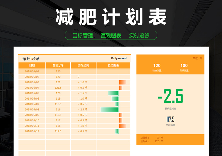 减肥计划表减肥管理减肥记录Excel模板表格直观图表实时追踪