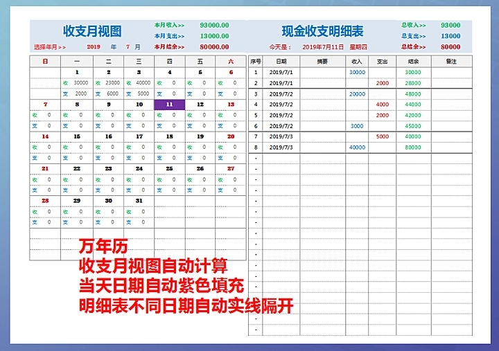 收支表(自动计算万年历查询)excel表格模板收支月视图自动计算自动颜色填充