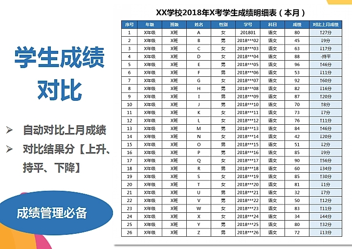 学生考试成绩对比(自动对比本次及上次考试)Excel表格模板公式