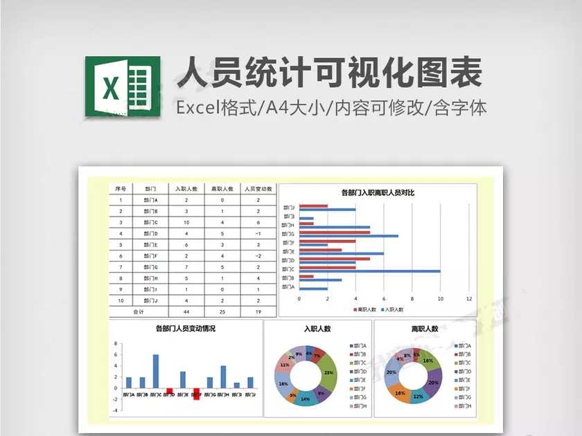 各部门入职离职人员对比统计可视化图表Excel表格模板人力资源表