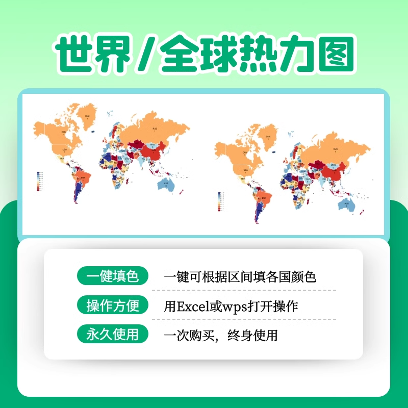 世界/全球热力图Excel表格电子模板一键填色可自定义颜色数值