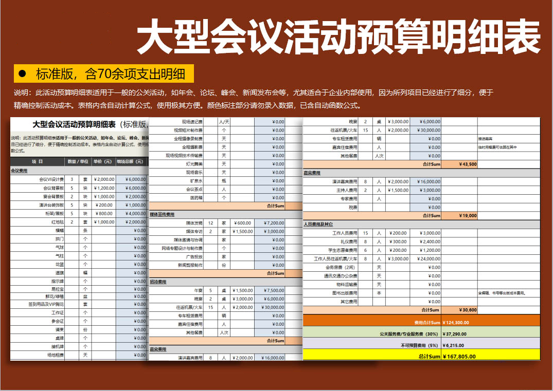 会议活动预算明细表Excel表格模板自动计算70余项支出明细