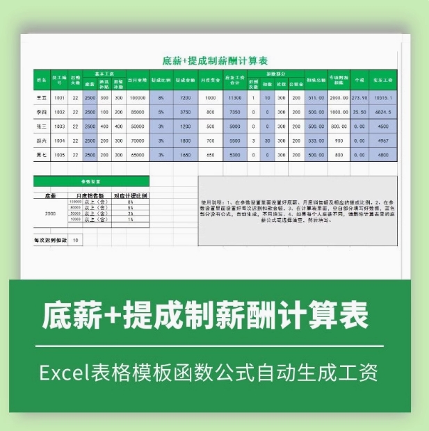 底薪业绩提成制薪酬计算表Excel表格模板函数公式自动生成工资
