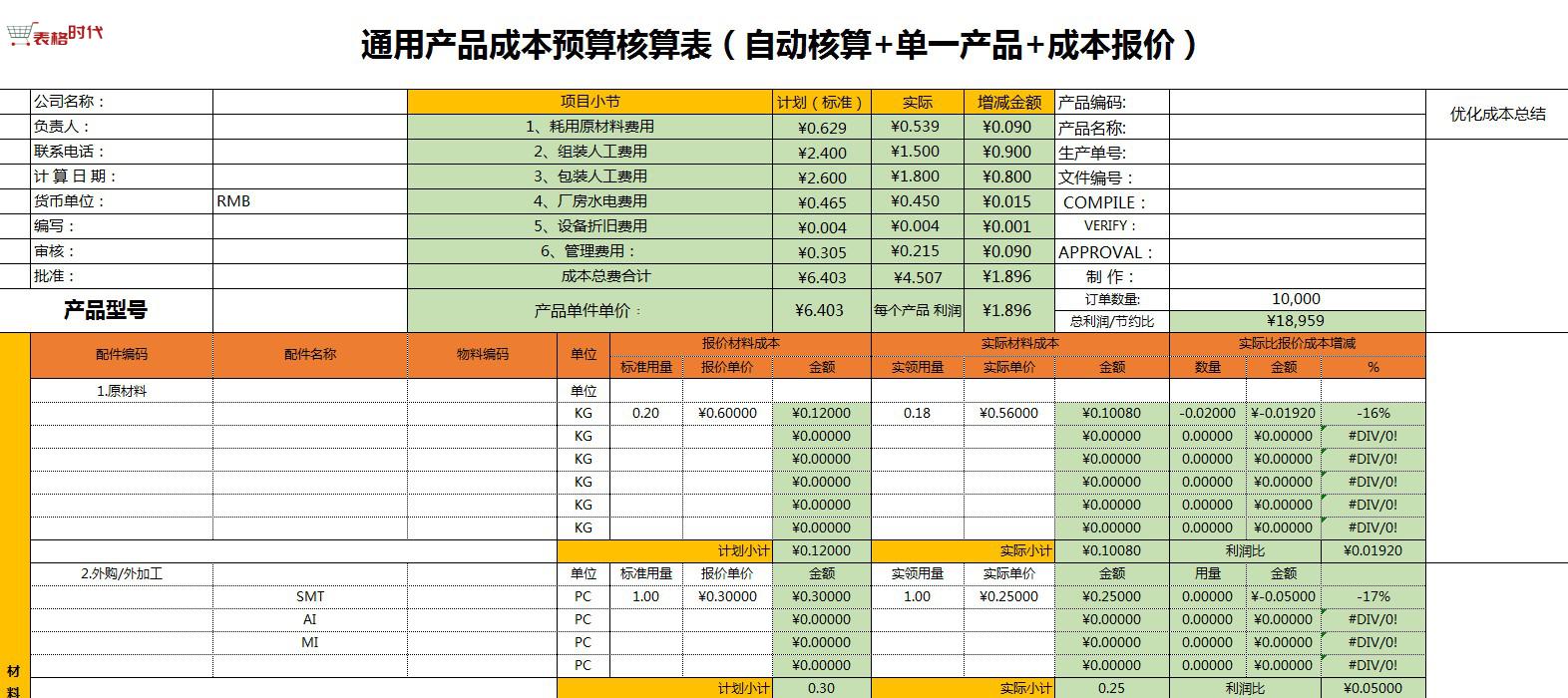 产品成本自动核算工具含预算与实际控制全自动计算Excel表格模板