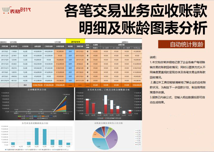 各笔交易业务应收账款明细及账龄图表分析excel表格模板