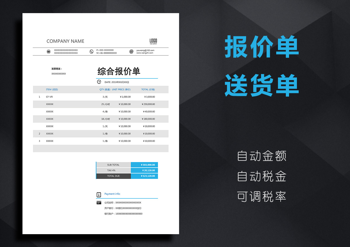 公司产品综合报价单送货单自动计算可调税率Excel模板表格统计