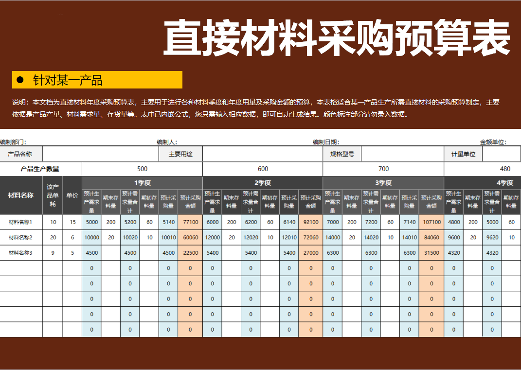 直接材料采购预算表(针对某一产品,含各季度)Excel表格模板