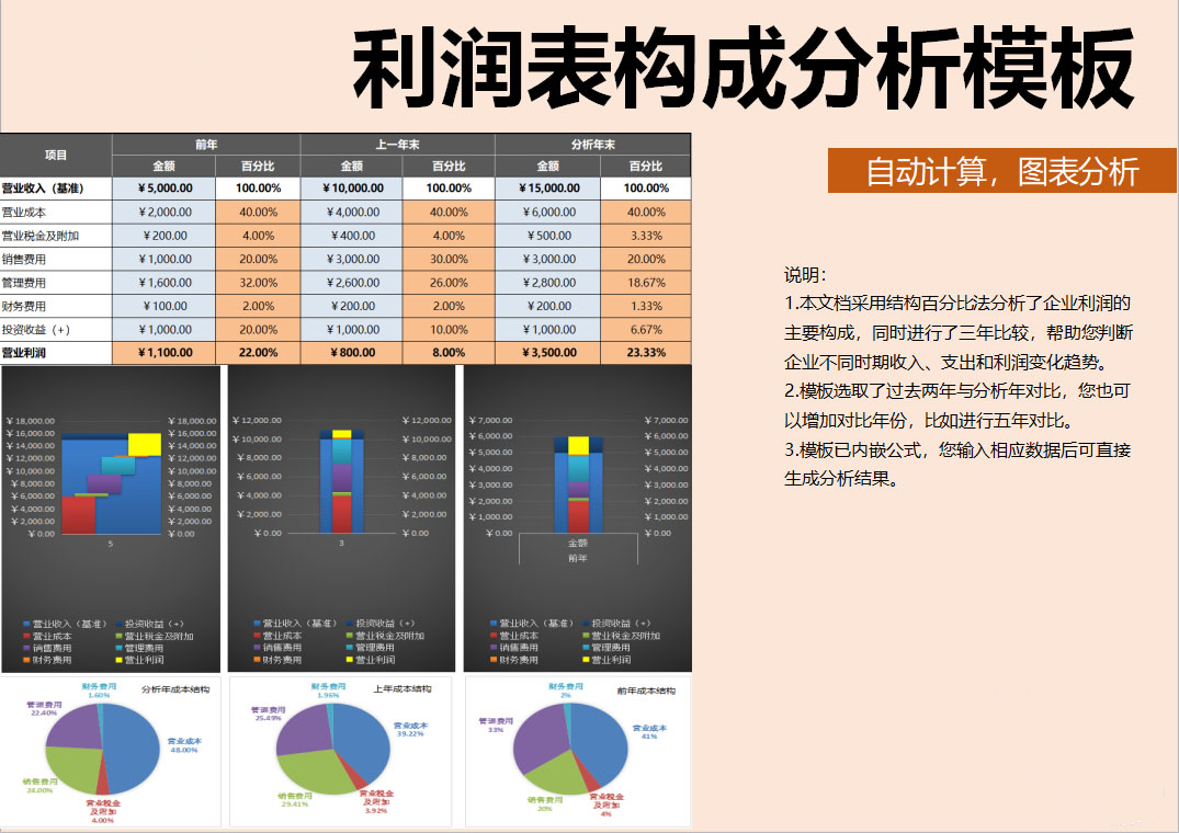简约财务营收分析报表excel模板表格同比增长率净利润条形折线图