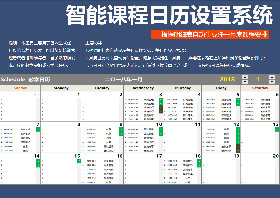 课程月日历智能设置根据明细表自动生成任一月度Excel表格模板