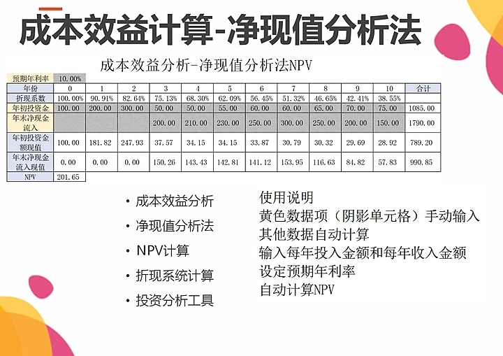 Excel表格模板成本效益净现值分析法NPV自动计算折现系统投资分析