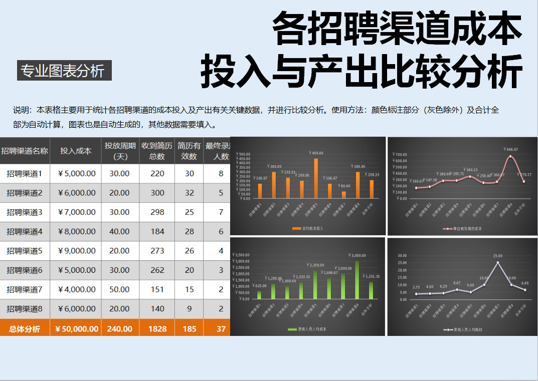 各招聘渠道成本投入与产出比较分析图表自动生成excel表格模板
