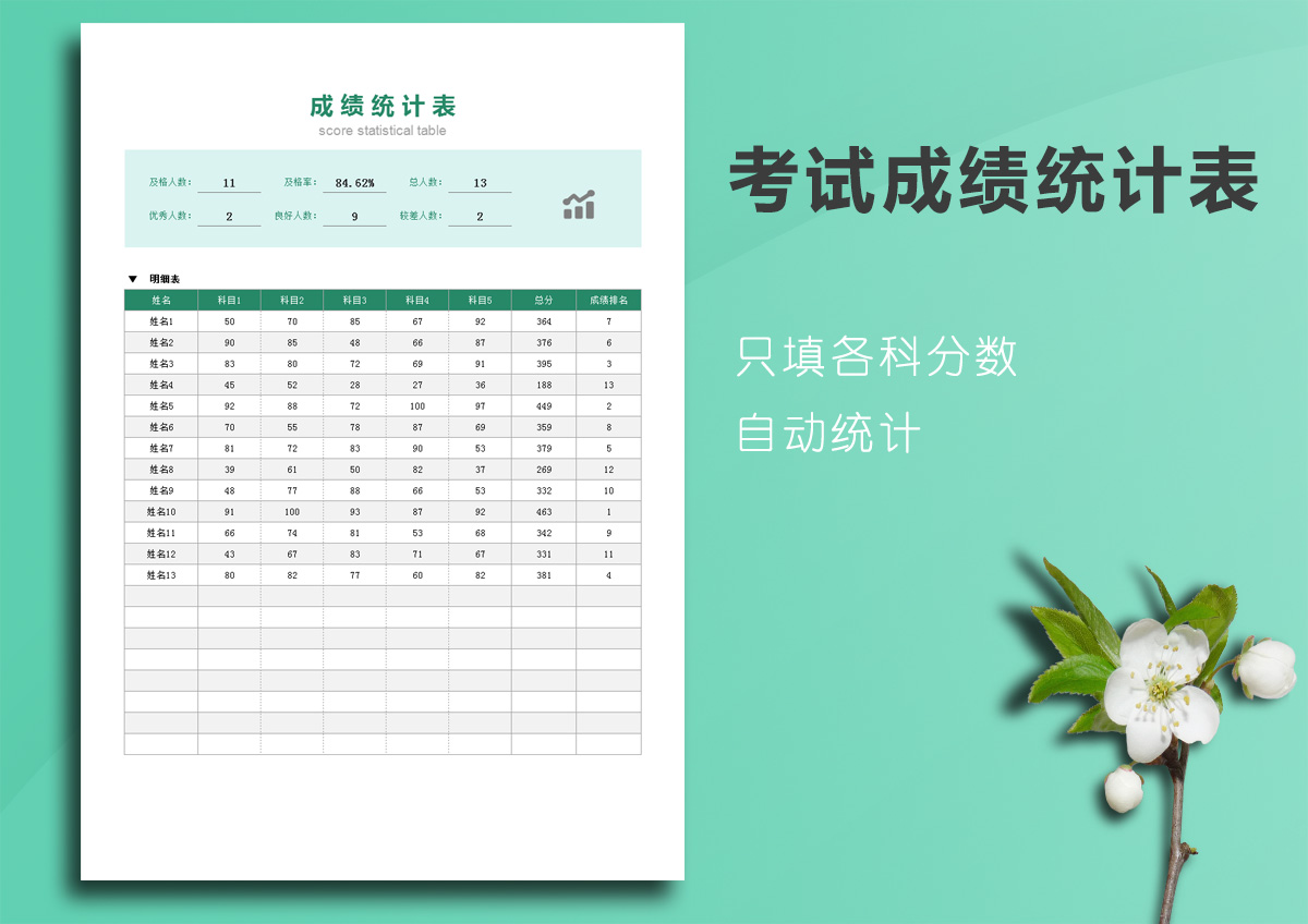 考试成绩统计表排名表Excel模板表格各科目自动统计